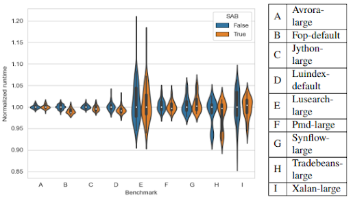 Figure 1: Violin plots of the relative throughput results with SAB enabled and disabled on different DaCapo benchmarks. Each benchmark was executed 50 times, the measured runtime for each benchmark ranges between 1-10 s.