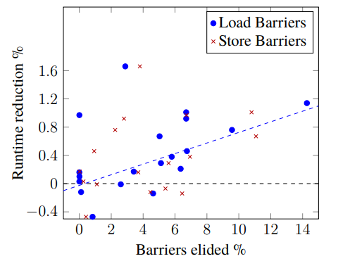 To count barriers, an instrumentation tool has to be implemented into the JVM. With this tool it can be determined that generally 10 - 20% of static barriers can be removed for most benchmarks. However, the number of dynamic barriers removed is often significantly lower, suggesting an existing limitation in removing barriers from repeated code. Figure 2 shows the runtime reduction in correlation with the percentage of median dynamic barriers removed from the DaCapo and SPECjvm benchmark suites. From this scatterplot, there seems to be a correlation between runtime reduction and dynamic barriers removed.
