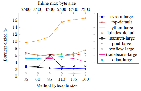 With these limitations in mind, a simple solution to improve barrier elisions might be to increase the inlining limits set by the compiler. Figure 3 tests this on the DaCapo benchmark suite, where each data point is the same benchmark with a different inlining limit. The limits are increased with Method bytecode size (max bytecode size for methods to be inlined) and Inline max byte size (max size of methods with inlined methods). However, as seen in Figure 3, this does not seem to be an obvious solution as most benchmarks do not get a significant increase in number of barriers dynamically elided. But on the contrary, the luindex-default benchmark shows that it might exist a benefit in enhancing the inlining decision.