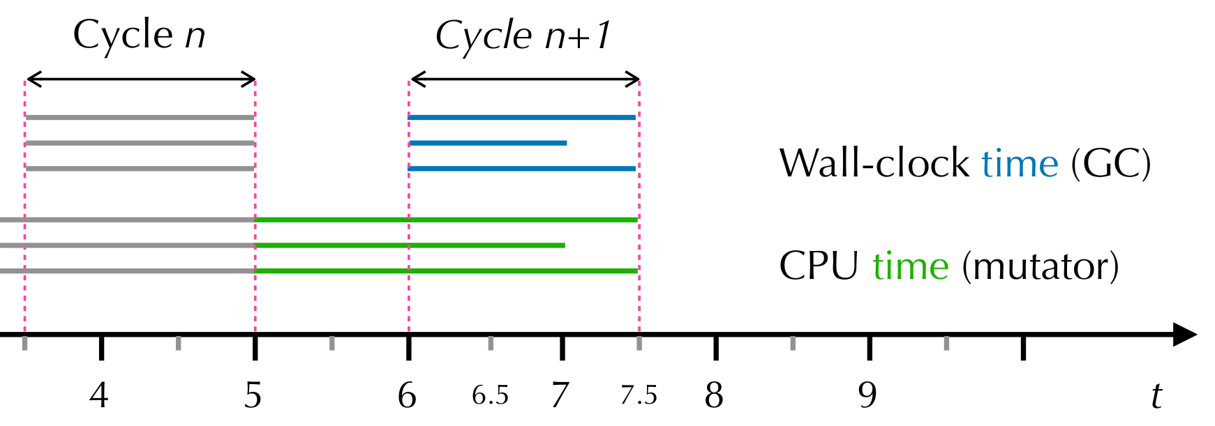Caption for Figure 1. Concrete measurements of GC and application time in our implementation. At the end of the GC cycle n+1 (t=7.5), we consider the time spent in GC threads (blue) and the time spent in mutators (green). Gray lines denote time measured at the end of GC cycle n. We only include the time when mutators were scheduled, meaning application time=2.5+2+2.5=7. In the case of GC Time, we measure from the start to the finish of the GC cycle. Thus, GC Time=3* 1.5=4.5, even though the 2nd GC thread was not scheduled after t=7. Thus, GC CPU overhead=4.5/7=~64\%. (This is unusually high — in most applications, GC accounts for less than 5%.)